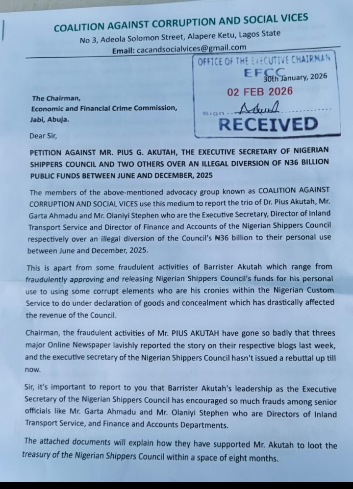 The Coalition Against Corruption and Social Vices (CACSV) has dragged the Executive Secretary of the Nigerian Shippers Council, Mr. Pius Akutah before the Economic and Financial Crimes Commission, EFCC over the illegal diversion of the Council’s N36 billion.