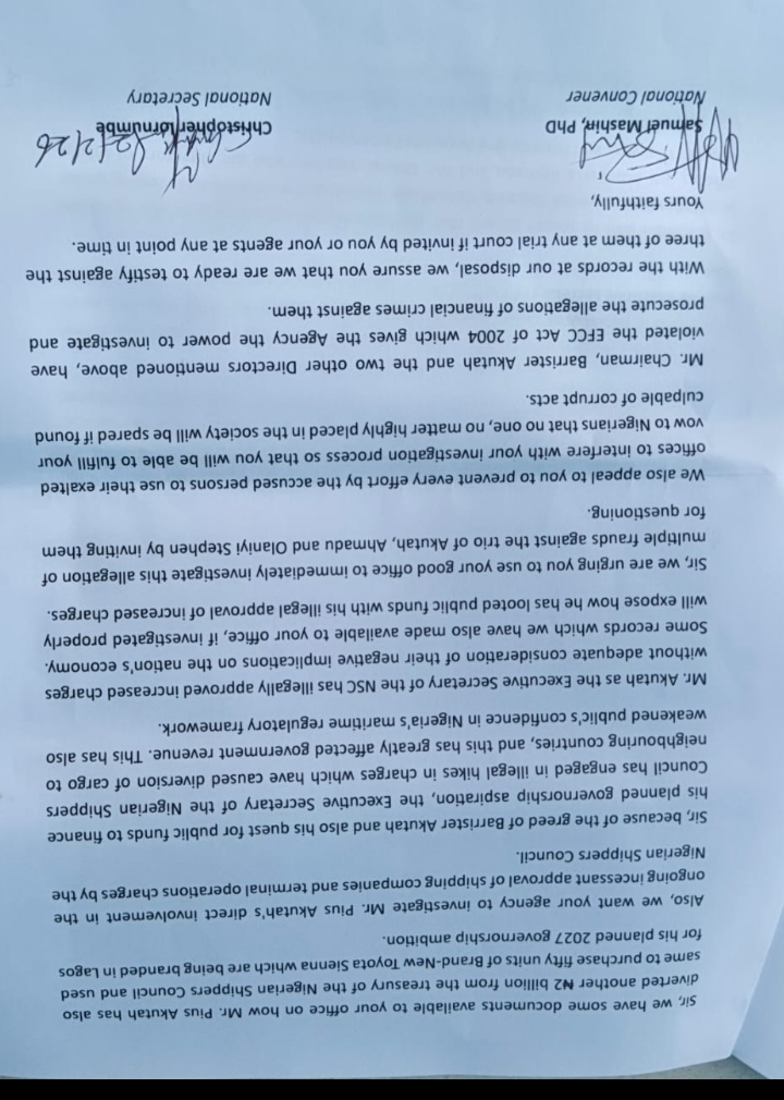 The group said it had submitted documentary evidence to the EFCC to support its claims and urged the Commission to invite the officials named in the petition for questioning.