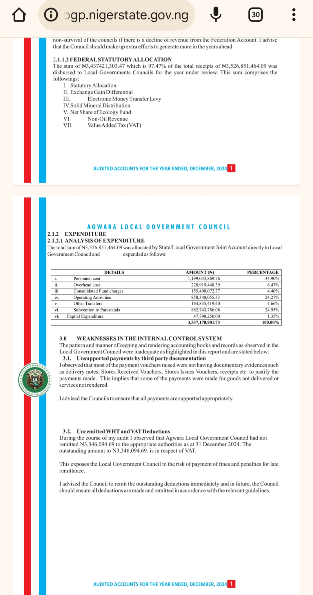 It was further observed that “during the course of the audit, it was observed that, Bida Local Government Council had not remitted N4,099,327.40 to the appropriate authorities as at 31 December 2024. The outstanding amount comprises of N2,480,913.70 in respect of WHT and N1,618,413.70 in respect of VAT.”