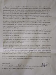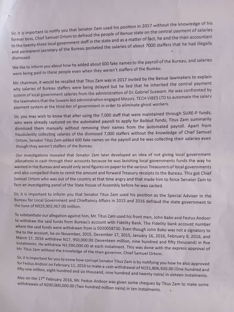 “Sir, it is important to inform you that Senator Titus Zam used his position as the Special Adviser in the Bureau for Local Government and Chieftaincy Affairs in 2015 and 2016 to defraud the state government to the tune of N929,903,967.00 million.