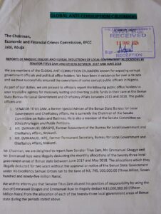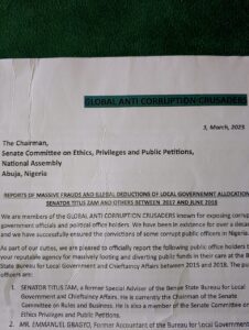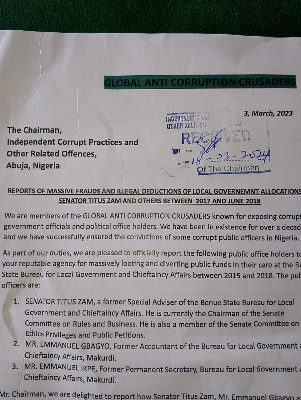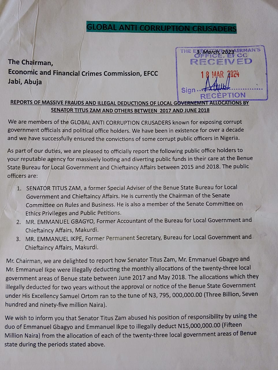 Global Anti Corruption Crusaders made a copy of the petition with EFCC Reference Number EFCC/PET/HQR/0747/2024 titled: “Report of massive frauds and illegal deductions of local government allocations by Senator Titus Zam and others” which was received by the EFCC headquarters in Abuja on Monday 18th March, 2024 to Nigerian Concord Newspaper recently.