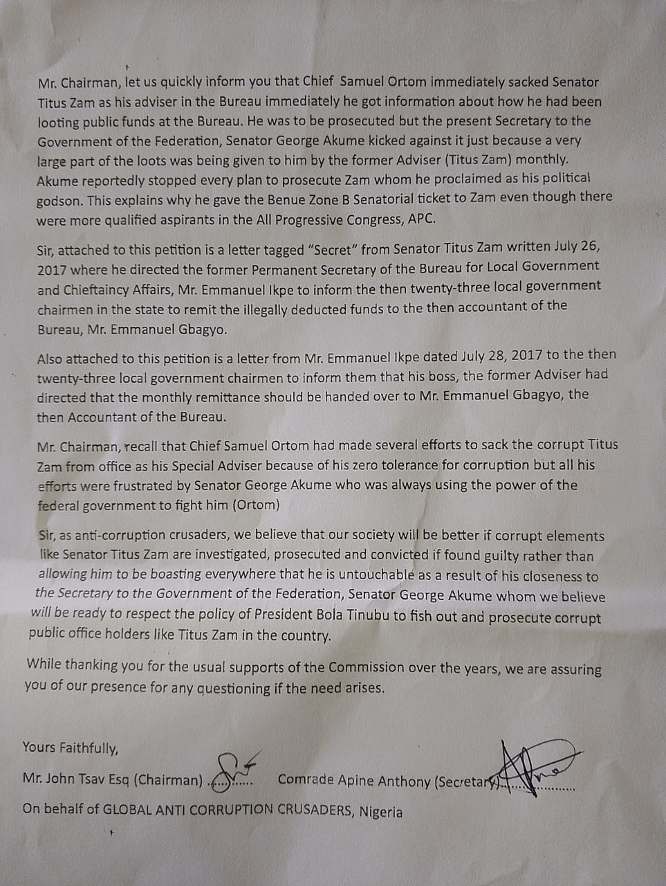 “Mr. Chairman, recall that Chief Samuel Ortom had made several efforts to sack the corrupt Titus Zam from office as his Special Adviser because of his zero tolerance for corruption but all his efforts were frustrated by Senator George Akume who was always using the power of the federal government to fight him (Ortom). Sir, as anti-corruption crusaders, we believe that our society will be better if corrupt elements like Senator Titus Zam are investigated, prosecuted and convicted if found guilty rather than allowing him to be boasting everywhere that he is untouchable as a result of his closeness to the Secretary to the Government of the Federation, Senator George Akume whom we believe will be ready to respect the policy of President Bola Tinubu to fish out and prosecute corrupt public office holders like Titus Zam in the country.