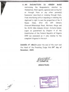 Delivering the judgement in suit number FHC/ABJ/CS/2385/2025 on November 24, 2025, the presiding judge, Honourable Justice R.N. Ofili Ajumogobia ruled that that the applicant has a right to own and possess her properties as mentioned in the addresses above as guaranteed by the 34 Constitution of the Federal Republic of Nigeria, 1999 as amended and the African Charter on Human and People’s Rights..