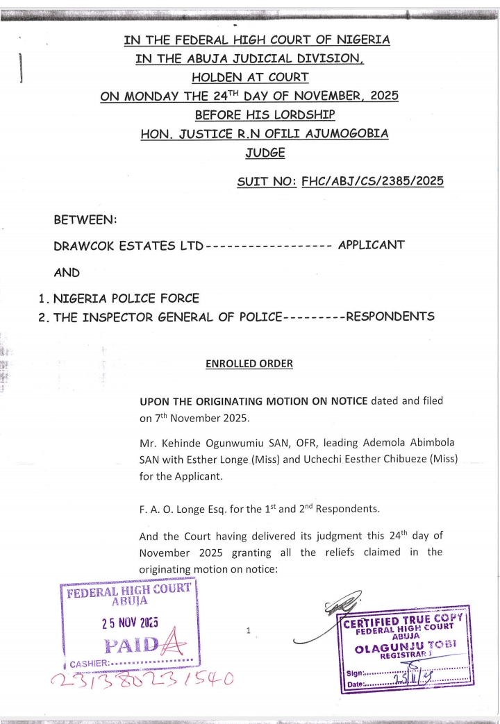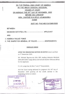 The order was pronounced after Drawcok Estates LTD had on November 7, 2025 through Mr. Kehinde Ogunwumiu, SAN, Ademola Abimbola, SAN with Esther Longe and Uchechi Chibueze prayed to the court to order the Nigerian Police Force and the IGP who are the first and second respondents not to interfere with or impend or violate her (applicant) right to own the properties on No. 4 Nyasa close, plot 19, Off Ontaria crescent /Mississippi road, Maitama Abuja and 41/42 Akin Adesola Street, Victoria Island, Lagos State as guarantees by the chapter 4 of the Constitution of the Federal Republic of Nigeria 1999 as amended as it only relates to the complaint litigated in the suit.