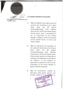 Giving her Orders in the case with suit number FHC/ABJ/CS/2385/2025 on November 24, 2025, the presiding judge, Honourable Justice R.N. Ofili Ajumogobia ruled that that the applicant has a right to own and possess her properties as mentioned in the addresses above as guaranteed by the 34 Constitution of the Federal Republic of Nigeria, 1999 as amended and the African Charter on Human and People’s Rights..