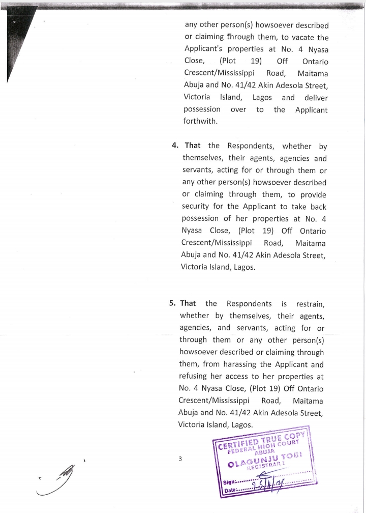 The judge also ruled that the Respondents, whether by themselves , their agents, agencies and servants, acting for it through them or any other person(s) howsoever described or claiming through them, to vacate the applicant’s properties on the addresses mentioned above, and deliver possession over to the applicant forthwith.
