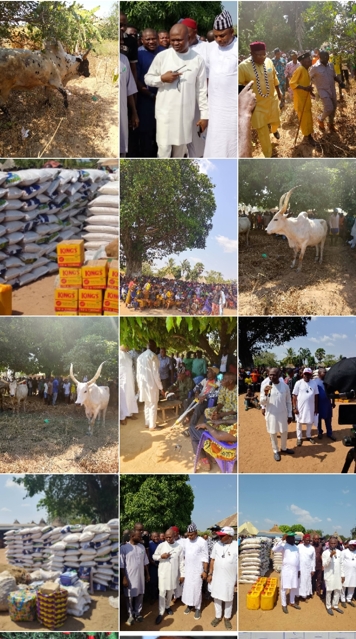 The event featured donations of clothing, cattle, bags of rice, beans, oil, and other food items to the community.