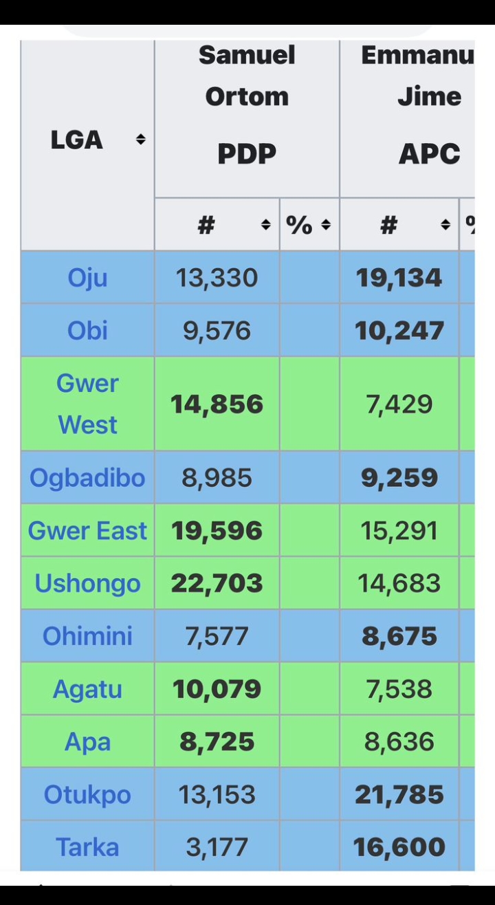 The official 2019 Benue governorship election results as declared by the Independent National Electoral Commission, INEC, which can still be accessed from the commission’s website, clearly show that Governor Samuel Ortom defeated his closest challenger, Emmanuel Jime of the APC, in six of the seven local government areas of Benue North East (Zone A).