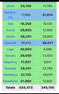 Kwande LGA: Ortom – 29,241 /Jime – 22,786