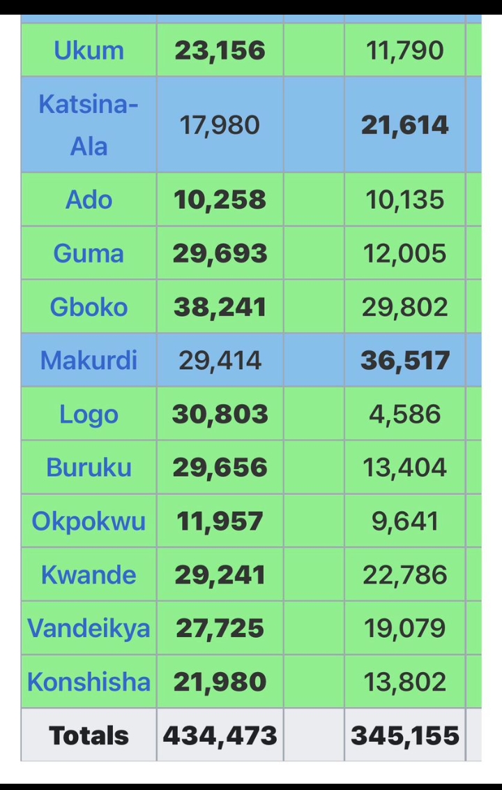 Ushongo LGA: Ortom – 22,703/Jime – 14,683