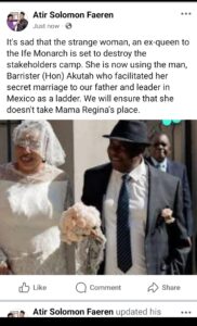 Faeren in his post which he made on Facebook few days to Christmas day accused Queen Zaynab Wuraola of using her influence to stop Akutah from getting Akume’s favour to be governor of Benue State in 2027. He believes that Queen Zaynab Wuraola is now working for the emergence of another aspirant to be governor of the state as a result of disturbing reports that the said aspirant (Name withheld) has opened an investment worth over N5billion for the SGF’s new wife..